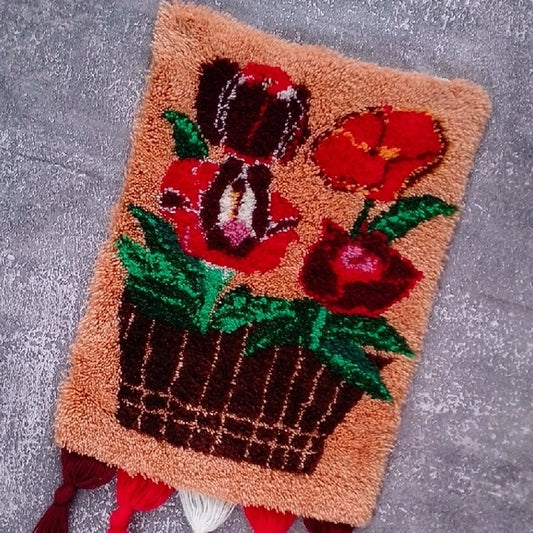 Vintage 70s Latch Hook Rug Floral Tapestry Wall Hanging with Tassels
