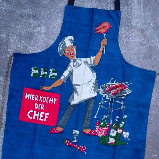 Vintage Novelty Print Blue Chef Apron "HIER KOCHT DER CHEF"