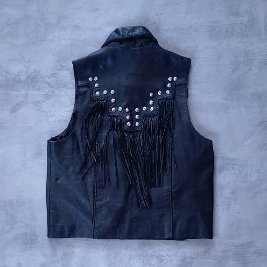 VINTAGE GENUINE LEATHER Black Leather Vest with Fringe and Studs