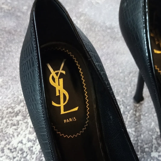 Yves Saint Laurent Paris Black Lizard Embossed Leather Tribtoo Platform Pumps