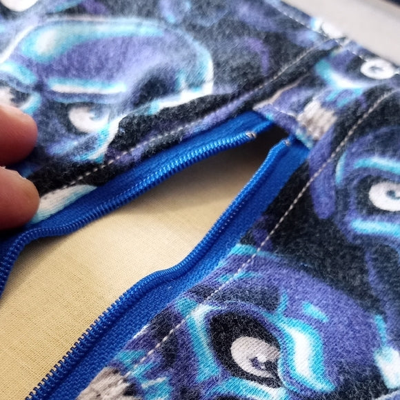 🔹 Handcrafted from repurposed Liquid Blue skullpile fabric