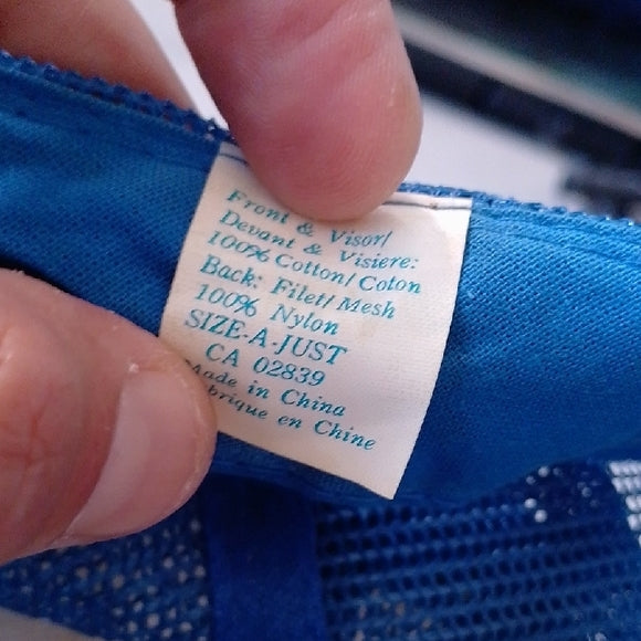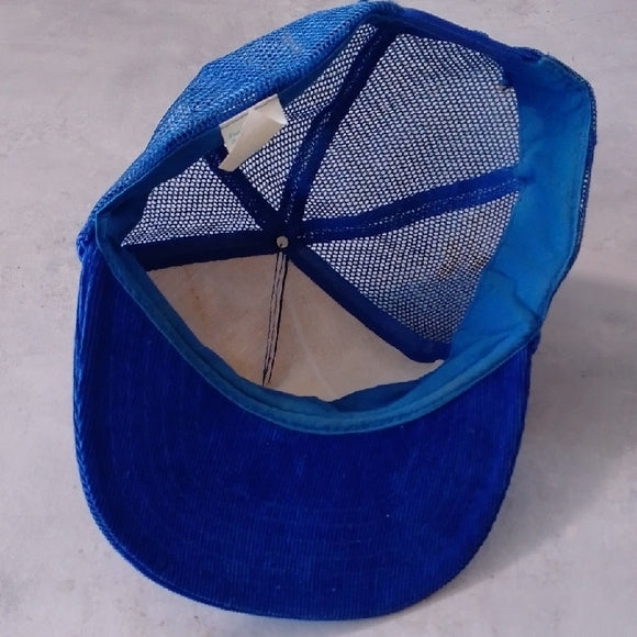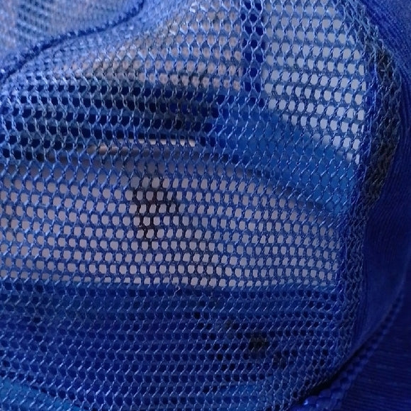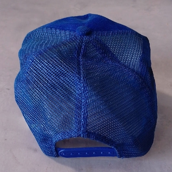Blue trucker hat featuring a white logo. Comfortable and stylish.