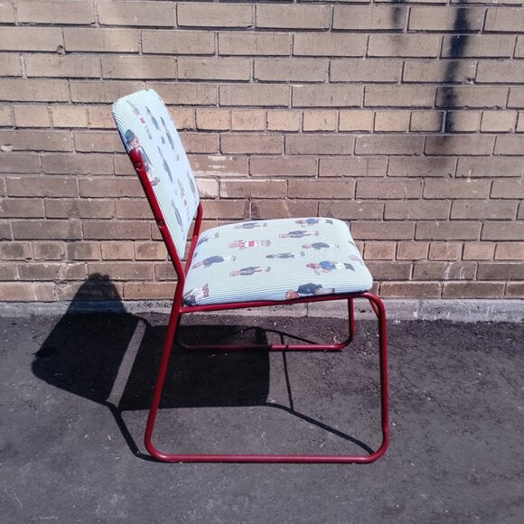 An icon of American luxury reimagined. This rare, one-of-a-kind chair began life as a classic vintage padded stack chair but has been artfully transformed with authentic 1990s Ralph Lauren Polo Bear bedsheets — one of the most coveted and collectible prints in Ralph Lauren history.