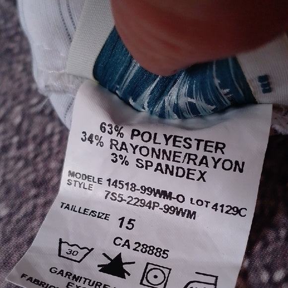 FABRIC: 63% POLYESTER / 34% RAYON 3% SPANDEX