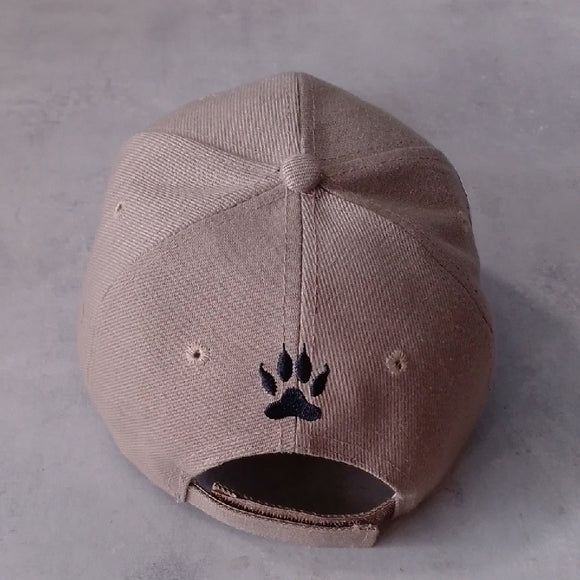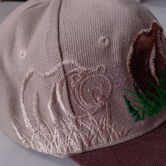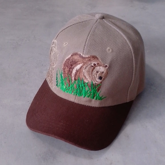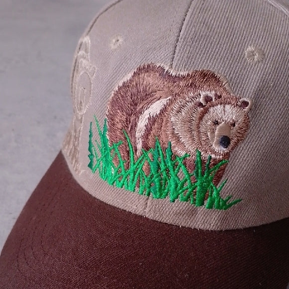 A nice cap featuring an embroidered bear design. Perfect for outdoor adventures. Available in brown and tan colors.