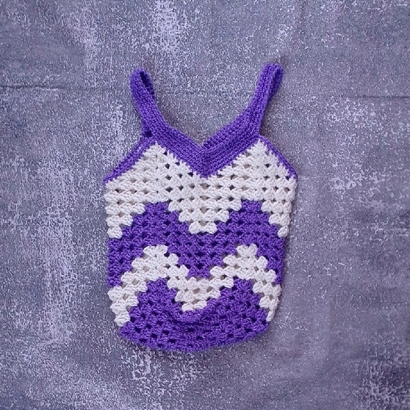 Stylish crochet bag in purple and white. Features a zigzag pattern .
